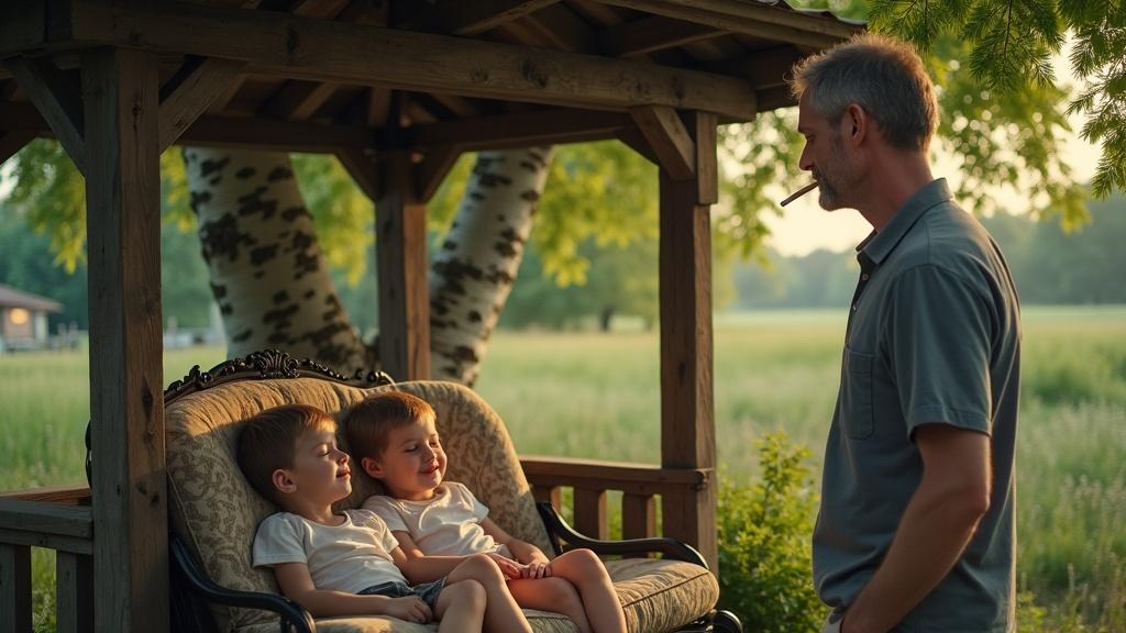 2005 год. Деревня замерла. Жаркий летний полдень разогнал всех жителей по домам. В прохладе густой кроны старой берёзы стоит беседка. На небольшом диванчике спят пятилетние двойняшки Коля и Катя. Они улыбаются во сне. Рядом с ними мужчина задумчиво курит. На его памяти всплыл тот далёкий 1972 год.