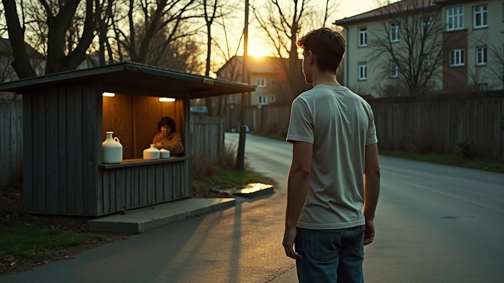 (1980 год). Огляделся и удивлён. «Где киоск? Где стройка?» — не понимает он, — «Откуда на месте стройки деревянный маленький магазинчик? Его же лет десять, как снесли?» В это время двери магазина распахнулись и вышли две женщины. Одна прошла вдоль дороги прочь. А вторая, пожилая с трёхлитровым бидоном и авоськой идёт прямо в его сторону. Дмитрий задохнулся от волнения и уставился на женщину.