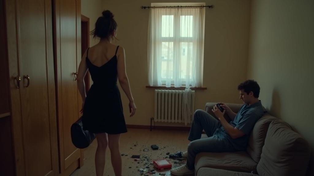 Уходя, Лера задела сумкой тумбочку. Посыпалось всё с тумбочки на пол, зазвенело. Цокнул плеер Максима. Отлетели какие-то куски. Максиму показалось, что вздрогнула земля. Лера мрачно посмотрела на обломки.