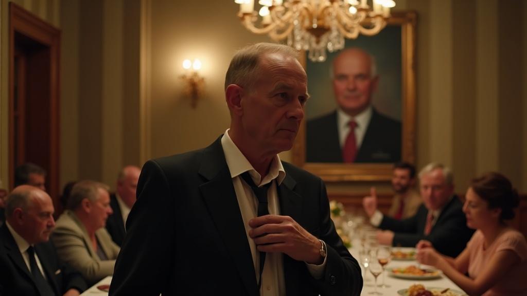 И вот теперь в этой празднично украшенной столовой с большим портретом покойного в центре зала (лентой чёрной юбилейное фото перевязали — и сразу печальная метаморфоза),‒ поминки.