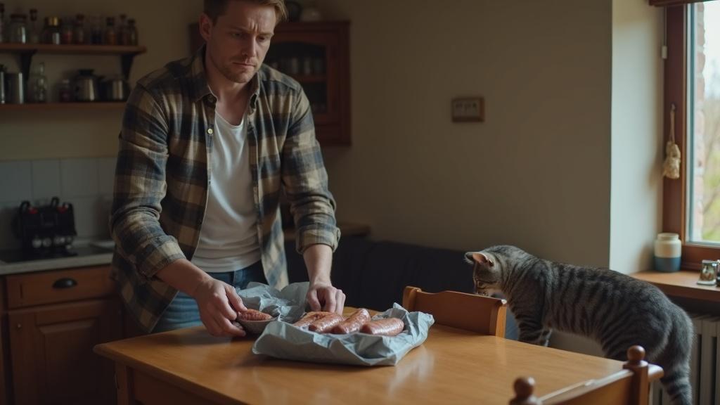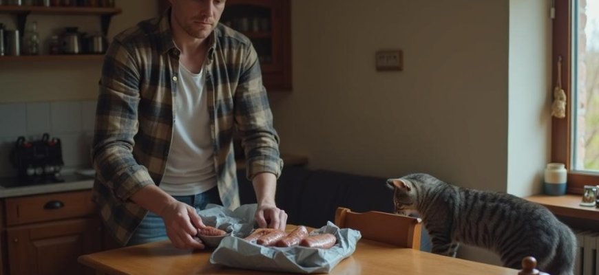 Воскресное утро в частном доме на окраине города. На столе лежат два свёртка в серой обёрточной бумаге. В одном — палка ливерной колбасы, а в другом, излучающий немыслимые запахи, хороший ломоть колбасы любительской. Хозяин только, что принёс их из магазина, положил на стол и вышел.
