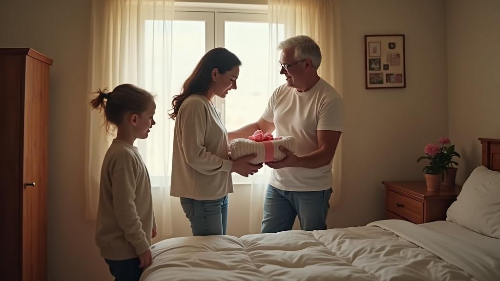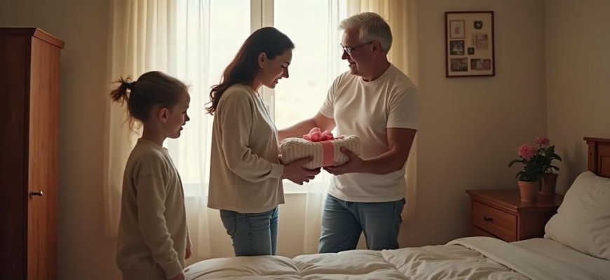 Ясный апрельский день. Родители торжественно вносят в квартиру маленький свёрток, перевязанный атласной лентой. Кладут его на кровать. Оба радостно переглядываются. Ждут реакции старшей дочери.