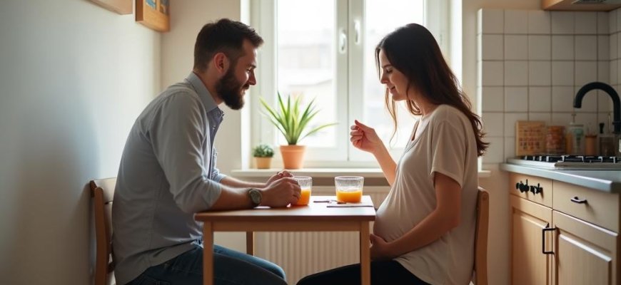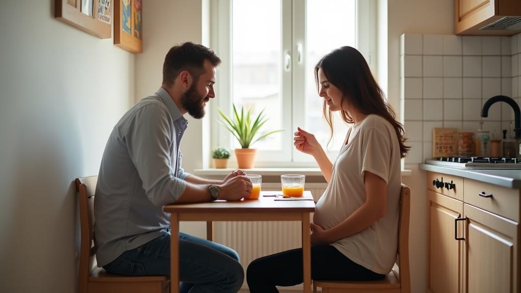 Утро в городской квартире. На кухне завтракает муж. Жена, с огромным животом на последнем месяце беременности, сидит рядом и пьёт сок.