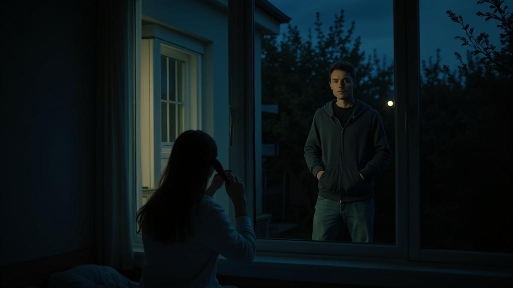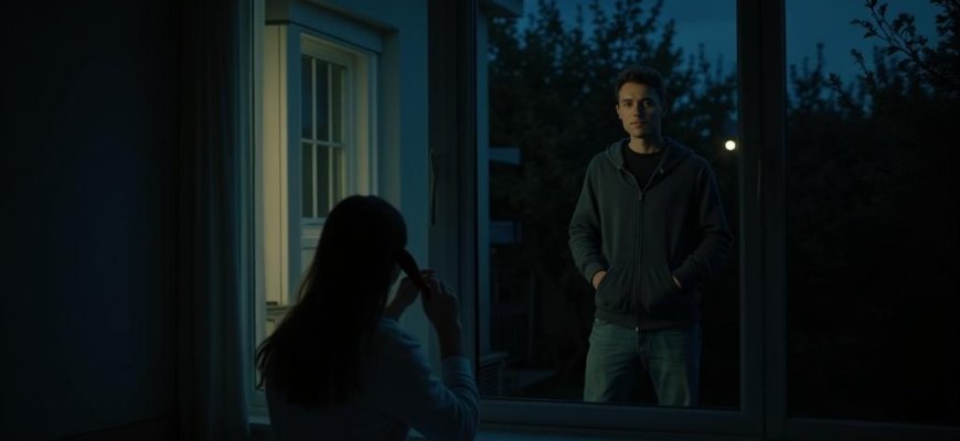 Летний вечер. Темно. Во дворе частного дома за кустами сирени прячется мужчина. Он заглядывает в окно. Там перед сном у зеркала расчёсывает волосы молодая женщина.