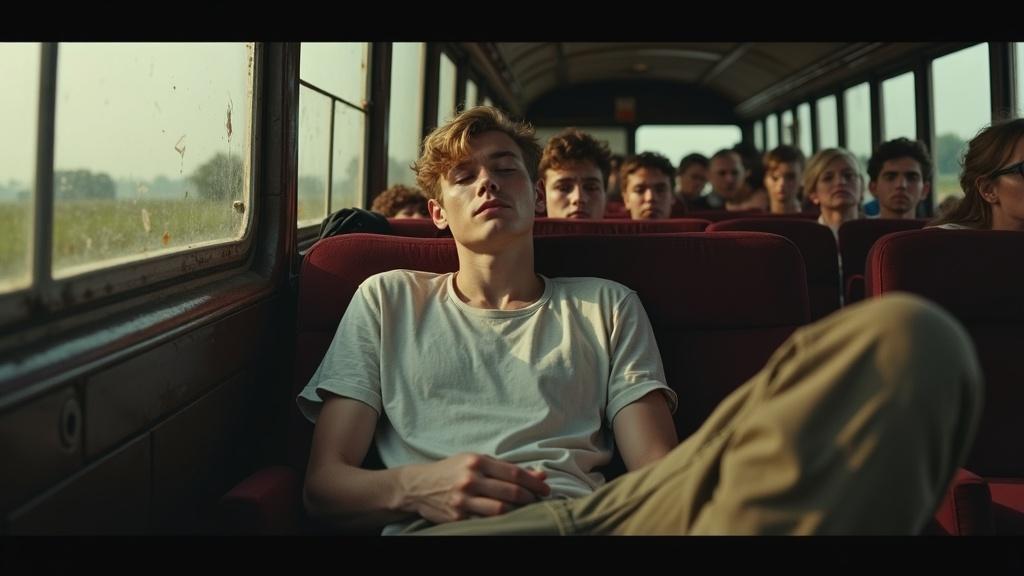 Качаясь, как ребёнок в люльке, он пытается заснуть. Изредка открывает глаза и смотрит на поля и лес за окном. Наконец задремал.