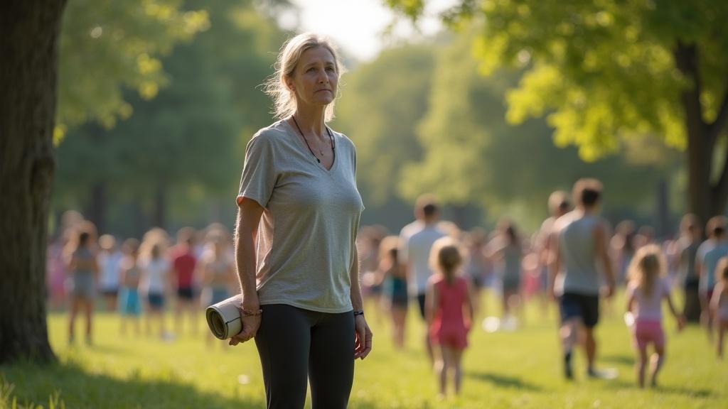 Виктор заметил группу людей с ковриками издалека. Он медленно подошёл ближе, поглаживая бороду — жест нервозности, выработанный за годы работы в бухгалтерии. Это было его первое занятие йогой: друзья настоятельно советовали попробовать что-то новое после развода. Он огляделся — большинство участников были моложе него и выглядели уверенно, словно ходили сюда не первый месяц. На аллеях ещё гуляли семьи с детьми, а солнце садилось медленно, окрашивая листву в золотистые оттенки. Виктор вдохнул поглубже и попытался не думать о том, как неуклюже он сейчас выглядит.