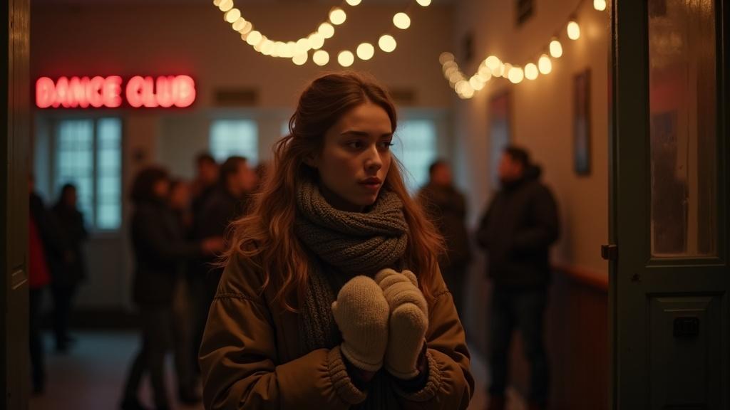 Валентина стояла у двери зала, прижимая к груди вязаные варежки. Вокруг гудели приглушённые голоса, из глубины доносилась музыка, будто сквозь толщу снега. Она медлила, переводя взгляд с обшарпанной таблички «Танцевальный кружок» на свои ботинки, на носках которых виднелись белёсые разводы от соли. Внутри всё сжималось: зачем она пришла сюда, в этот дом культуры, где в раздевалке смешивались запахи зимних шуб и чужих духов? Она задержала дыхание, ощущая, как шерстяной шарф давит на шею, и, наконец, решилась — шагнула внутрь.