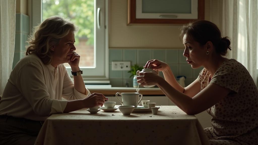 Марина Петровна сидела на кухне со своей давней подругой и соседкой Антониной Васильевной. Женщины пили чай с баранками и обсуждали последние новости. Марина выглядела расстроенной и время от времени тяжело вздыхала.