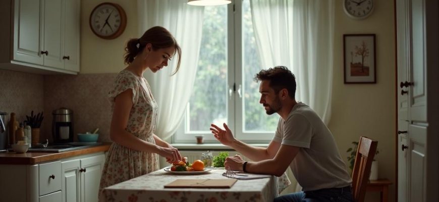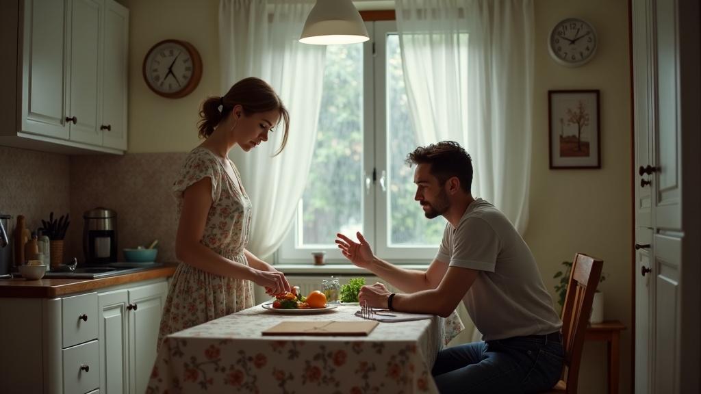 Девушка отложила в сторону нож, повернулась к мужу и внимательно посмотрела на него.