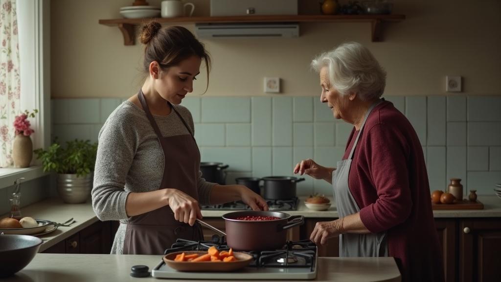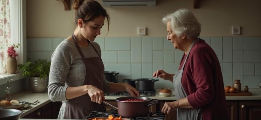 — Опять морковь крупно режешь, — проворчала пожилая женщина, заглядывая в кастрюлю. — Я же тебе сто раз показывала, как надо.