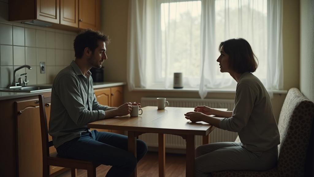 Он кивнул, хотя в его взгляде всё ещё читалось недоверие. Настя указала на диван в гостиной, и они сели – она на одном конце, он на другом, словно между ними пролегла невидимая пропасть.