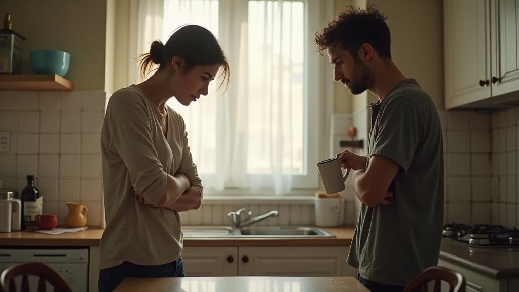 Утренний свет лился через окно, отражаясь на белых плитках столешницы, но атмосфера в комнате была далека от уюта. Вика скрестила руки на груди, её карие глаза метали молнии. Игорь, наоборот, выглядел растерянным, его тёмные волосы торчали в разные стороны после беспокойной ночи.