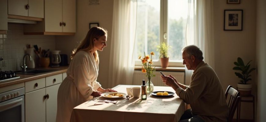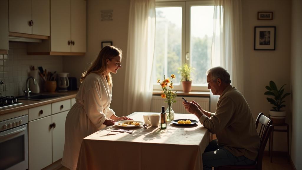 Алексей, ее Лёша, уже сидит за столом, уткнувшись в экран телефона. Он просматривает новости, хмуря брови. Марина ставит перед ним чашку с ароматным кофе, именно так, как он любит — с двумя ложками сливок.