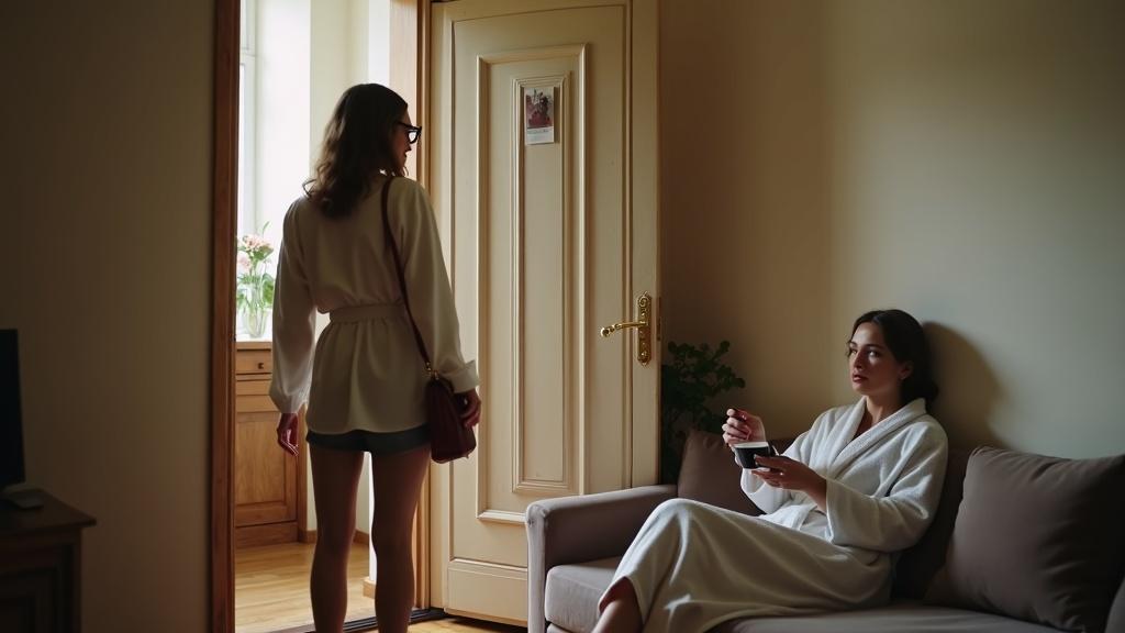 В прихожей, развалившись на диване с чашкой кофе, сидела женщина. Длинные ноги, дорогой халат, идеальный маникюр. Она медленно подняла глаза и удивлённо приподняла бровь.
