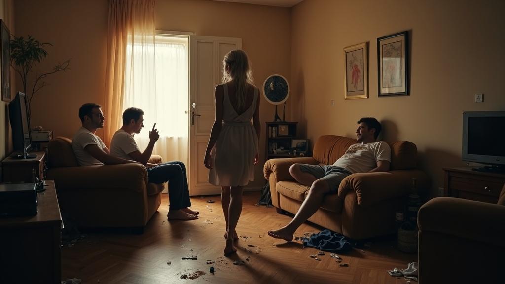 Запах алкоголя, табака и чего-то жареного ударил в нос. В прихожей валялись чужие куртки, на полу — следы грязной обуви. Из гостиной доносился хриплый смех.