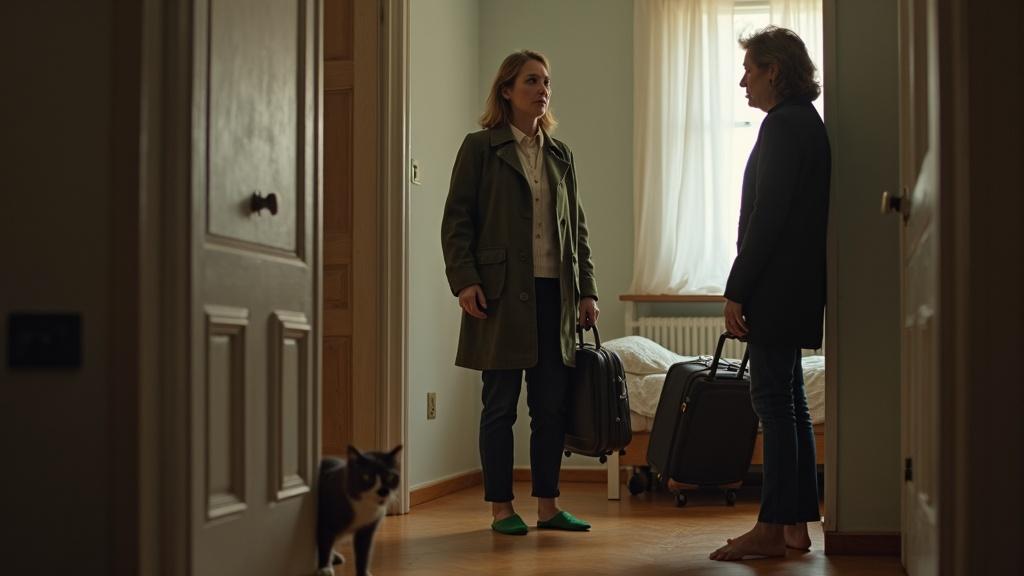 Но разговор перенесли ко мне в прихожую, вместе с двумя чемоданами, клетчатой сумкой и её фирменными зелёными тапками, которые она всегда таскала с собой «на всякий случай».