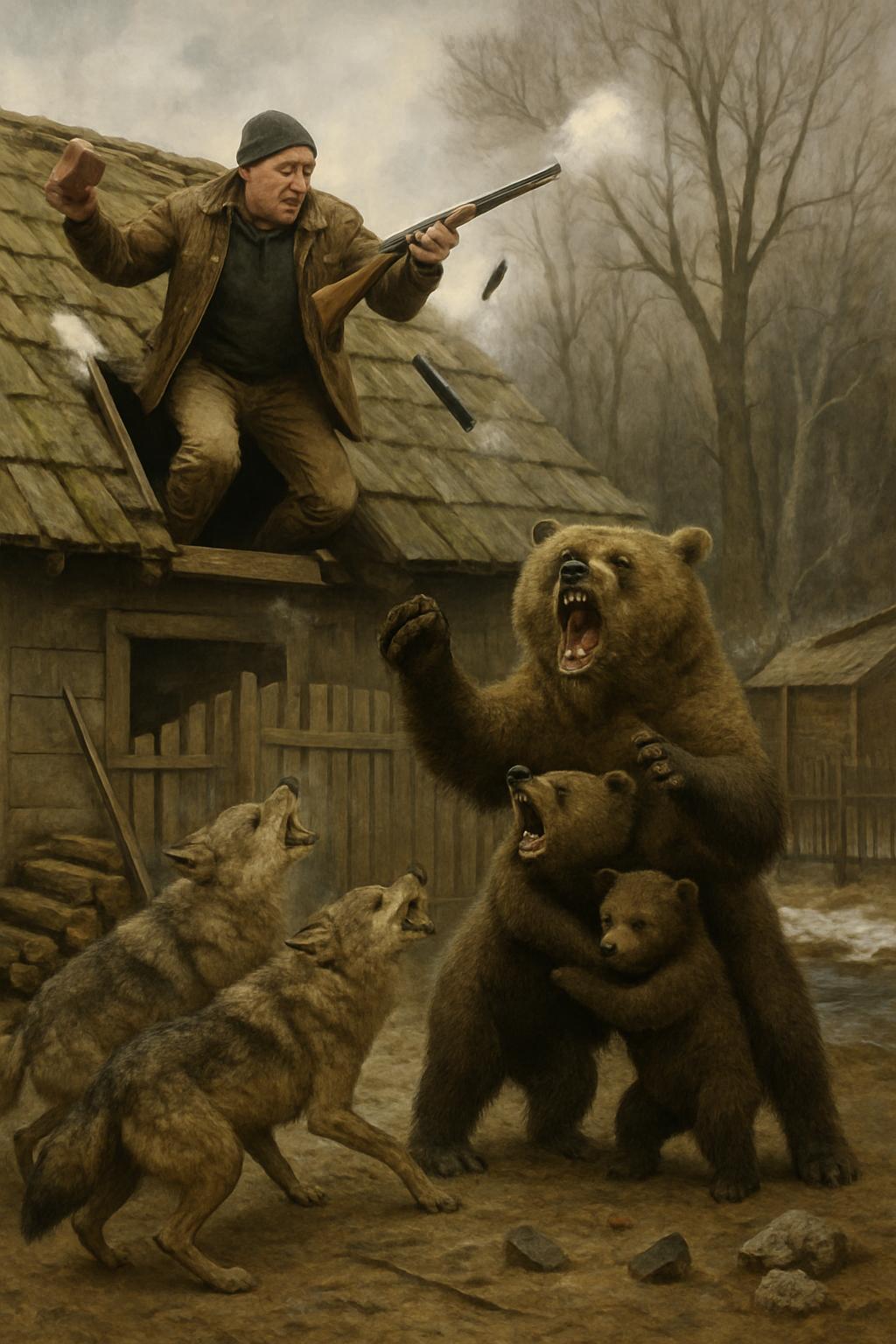 Лесник как раз в этот день с самого утра наводил порядок в сарае. Григорий зарядил ружьё и пальнул поверх волков. Убивать животных Григорий не любил, но без ружья в лес выходить не решался. Патронов было жаль, и Григорий стал бросать в волков осколки кирпичей и камни, которые откуда-то появились на крыше. Кое-как разогнал волков, а под шумок и медведица увела своих детёнышей в лес. Ещё хорошо, что на лесника не накинулась, уж она-то, наверное, смогла бы его достать на крыше, если бы захотела.