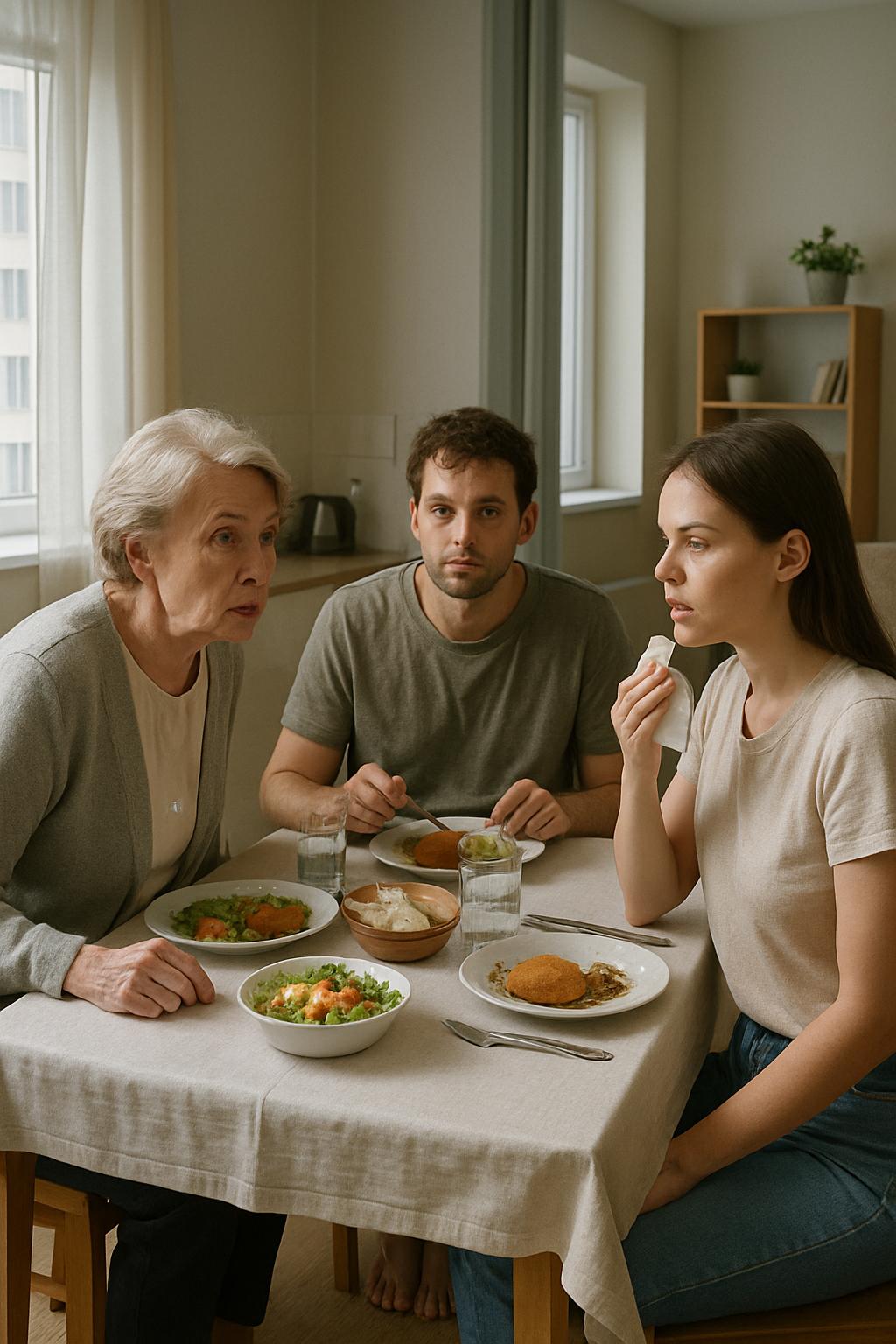 За столом повисла тишина. Саша, который до этого молча жующий котлету, поднял глаза и быстро перевёл взгляд с матери на жену и обратно. Он явно не знал, на чью сторону встать, и поэтому решил пока просто молчать.
