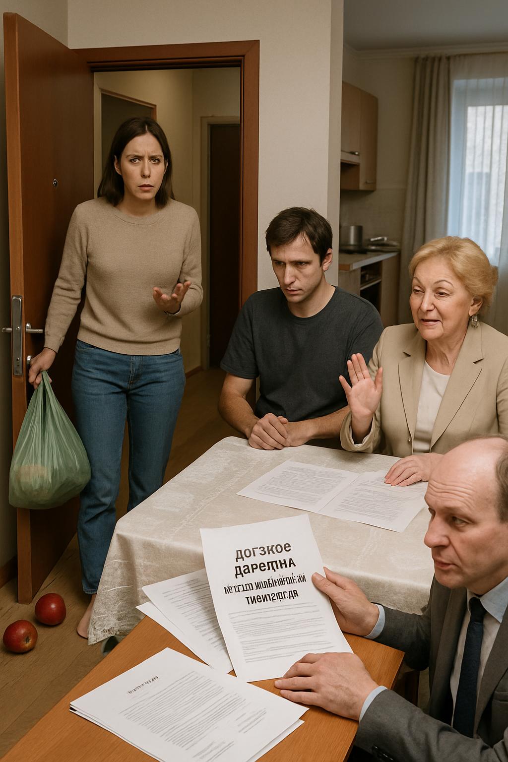 Она замерла на пороге, держа в руке пакет с продуктами. Ключи ещё торчали в замке. Мозг отказывался обрабатывать картинку, которая разворачивалась перед глазами: незнакомый мужчина в сером костюме, раскладывающий бумаги на её скатерти. Муж Антон, сидящий напротив с видом провинившегося школьника. И свекровь — Зинаида Михайловна — восседающая во главе стола, как королева на троне, с торжествующей улыбкой на тонких губах.