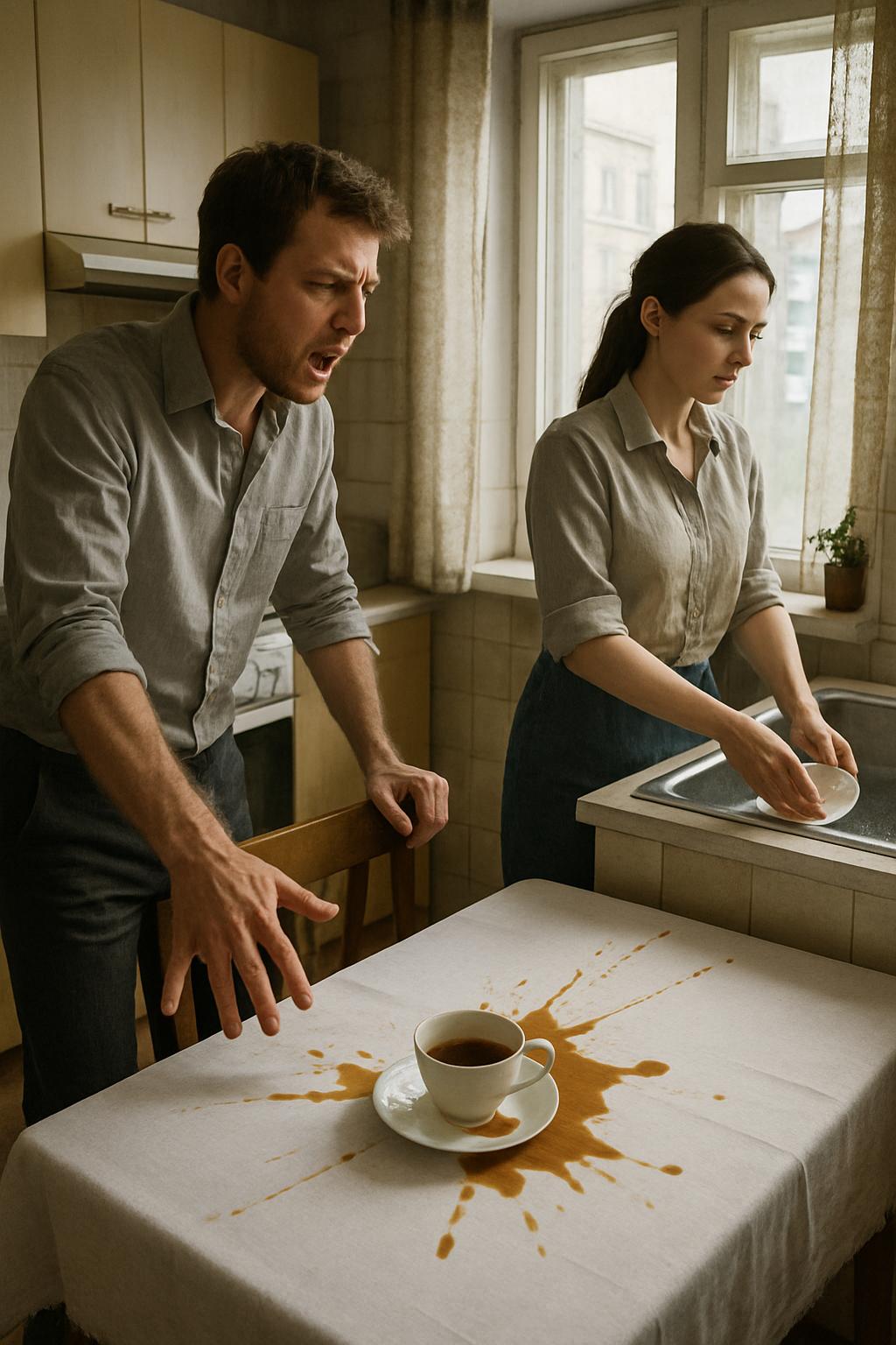 Ладонь Сергея опустилась на столешницу с таким грохотом, что чашка подпрыгнула, расплескав остатки чая на белую скатерть. Коричневые разводы расползлись по ткани, как кровоподтёки.