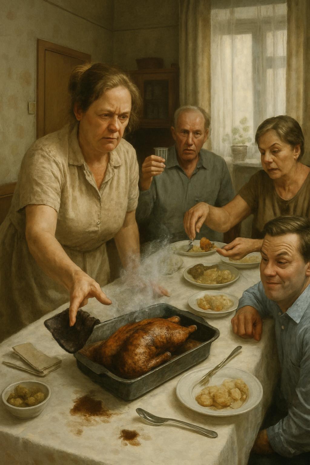 Она медленно стянула с руки прихватку и бросила её в центр стола. Тряпка шлепнулась прямо возле торта, оставив на белой скатерти жирное пятно. Мать ахнула. Отец нахмурился, собираясь отчитать дочь, но Елена перебила его звонком вилки о бокал.